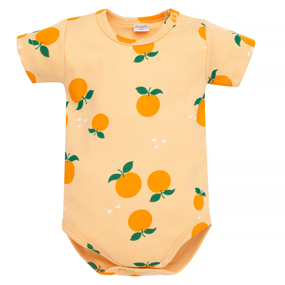 Body z krótkim rękawem z nadrukiem pomarańczy. Body zapinane jest w kroku i na lewym ramieniu na wygodne, bezniklowe zatrzaski.