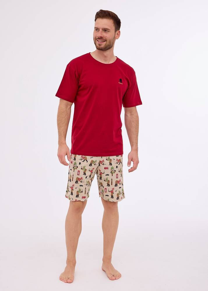 Koszulka ozdobiona niewielkim nadrukiem. Spodnie krótkie, wzorzyste. W pasie gumka. Pakowana w pudełko.