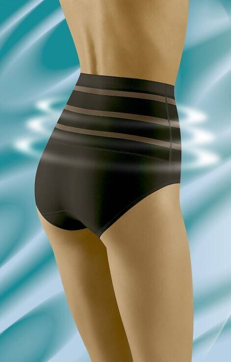 Figi damskie modelujące sylwetkę z wysokiej jakości mocno opinającej dzianiny. Idealnie podkreślają linię talii oraz opinają brzuch. Ozdobione paskami z transparentnej siateczki. Dół wykonany z miękkiej mikrofibry. Pas od wewnątrz z sylikonem.