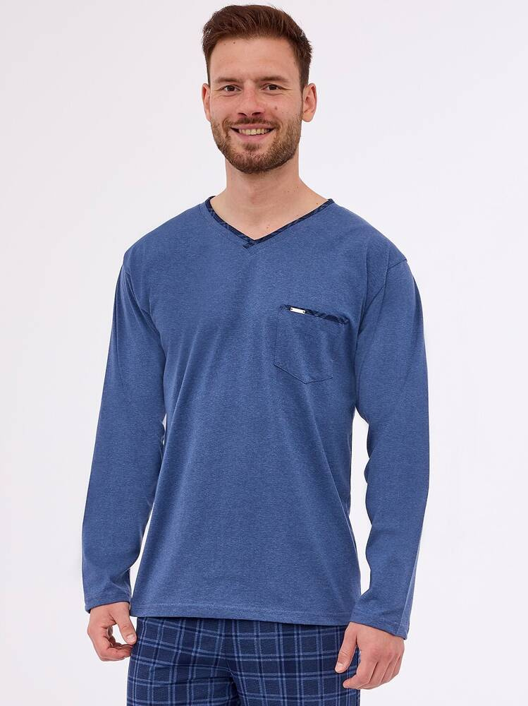 Bluza z długim rękawem, dekolt w serek. Na wysokości klatki piersiowej delikatny kieszonka. Do kompletu długie proste spodnie w kratę. Pakowana w pudełko.