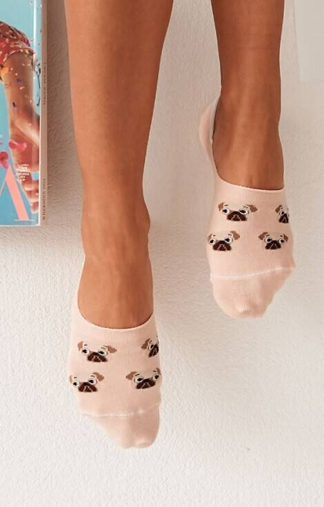 Bawełniane microstopki damskie ozdobione nadrukiem z pieskami. Płaskie szwy, nieuciskający ściągacz. Na pięcie od wewnętrznej strony silikon zapobiegający zsuwaniu.