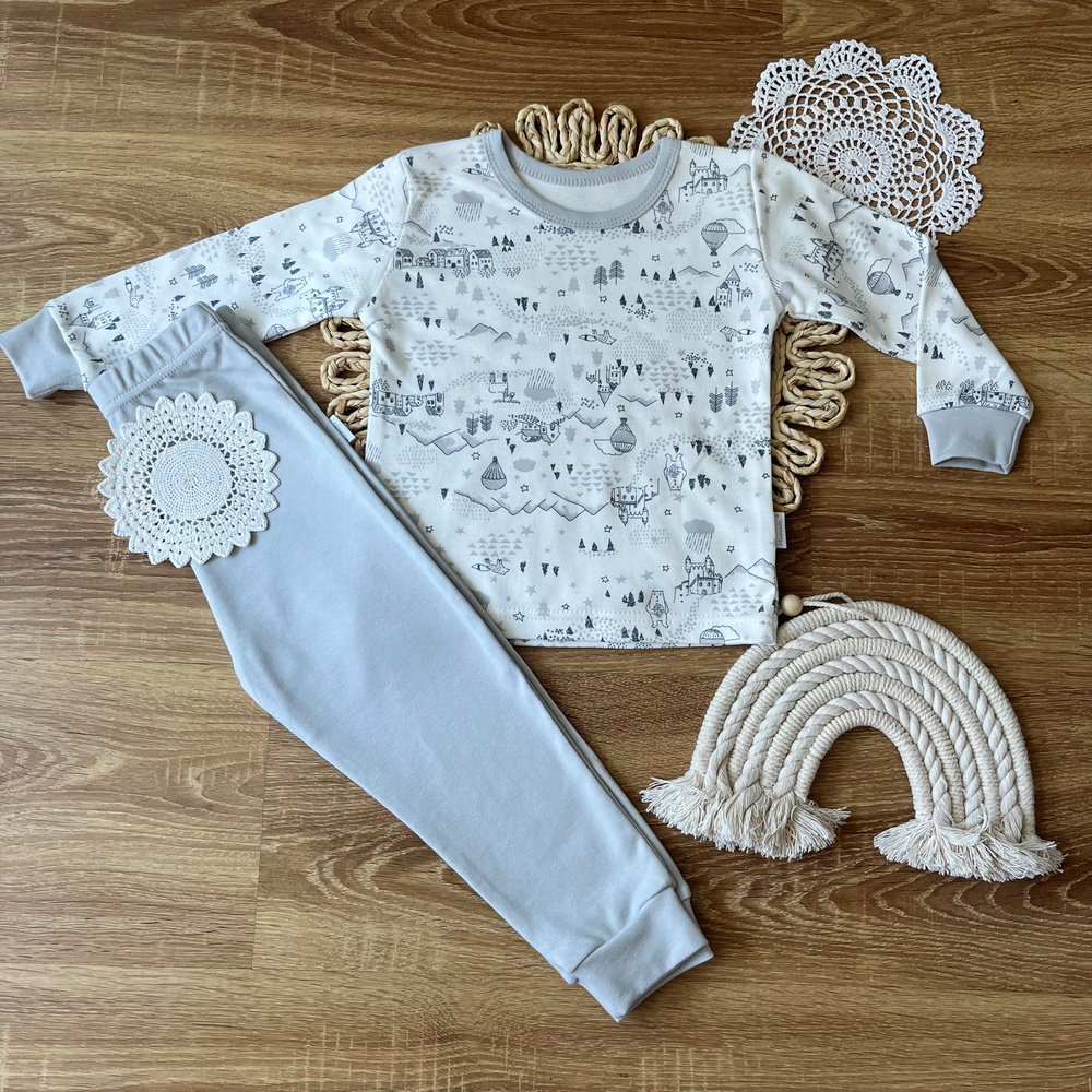 Dwuczęściowy komplet składający się bluzki z długim rękawem oraz długich spodni. Bluzka bawełniana w delikatny wzór, do kompletu gładkie spodnie zakończone ściągaczem.