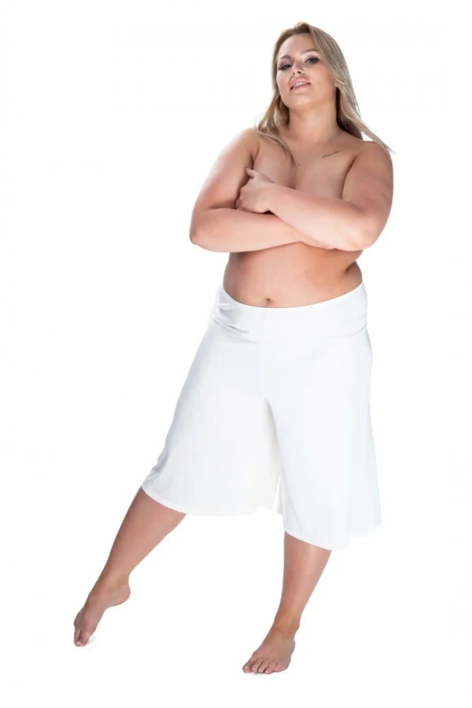 Półhalkospodnie proste w formie, wykończone gumka w pasie. Długością sięgające za kolana, delikatnie opływające kobiece ciało.