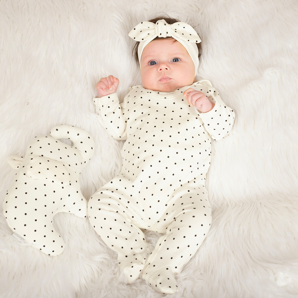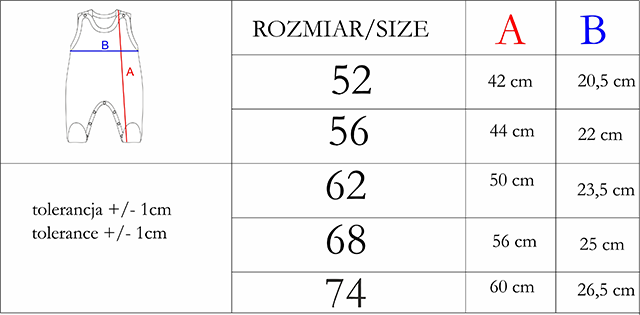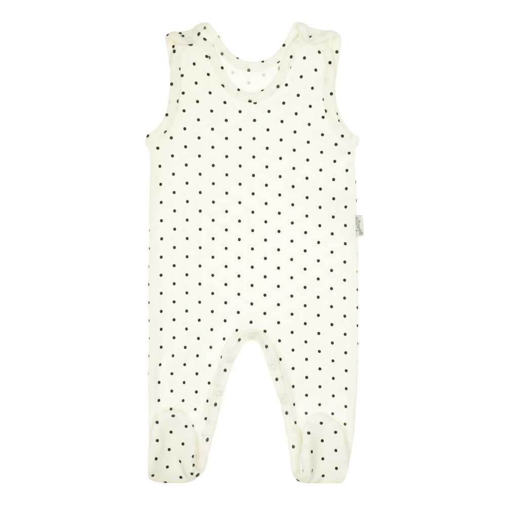 Wygodne śpioszki, wykonane zostały ze 100% bawełny. Na ramiączkach rozpinane są bezniklowymi napkami, a stópki zabezpieczone są delikatnymi ściągaczami, zapobiegającymi zsunięciu się ubranka.