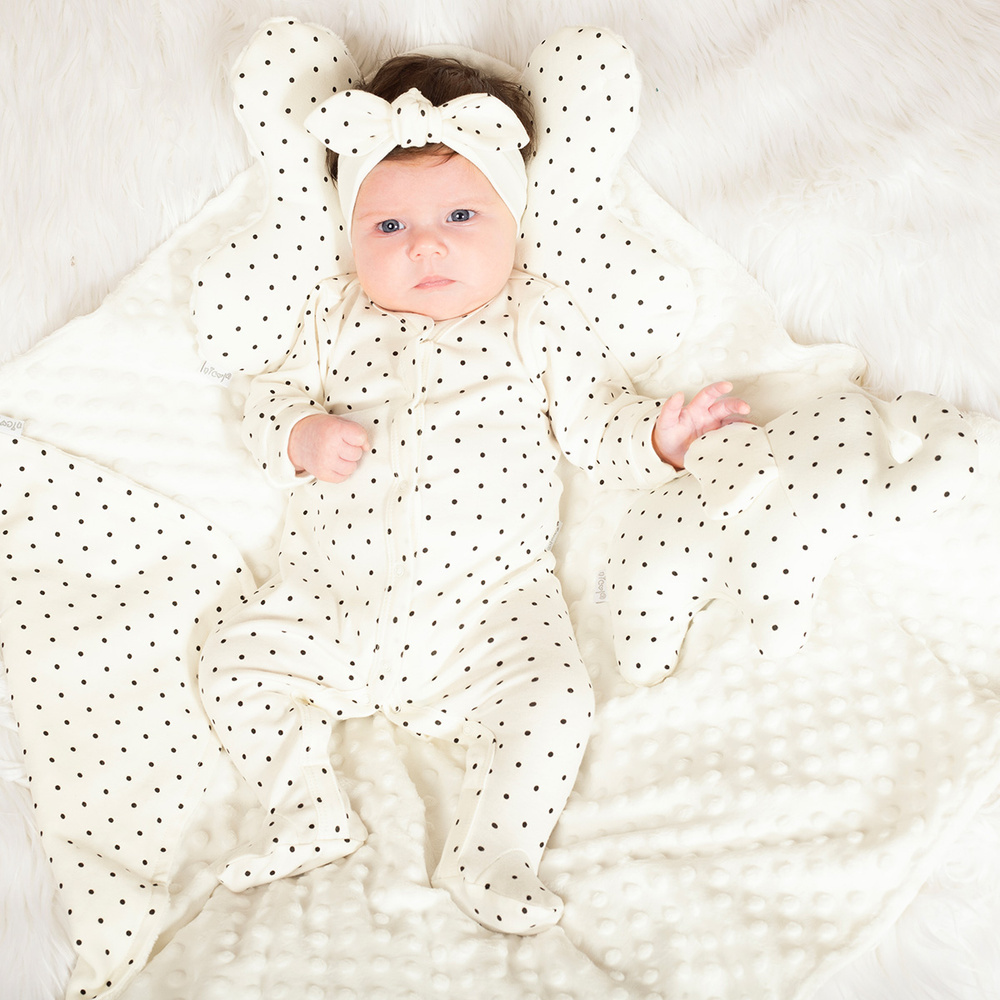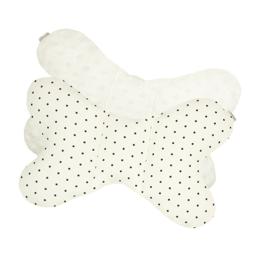 Poduszka motylek, wygodna i miła w dotyku. Jedna strona wykonana jest z wzorzystego materiału w kropki. Druga w kolorze kremowym. Wypełnienie składa się z antyalergicznego puchu. 100% bezpieczne dla dziecka. Doskonale sprawdzi się jako pierwsza poduszka dla maluszka. Może pełnić również funkcję poduszki dwustronnej.