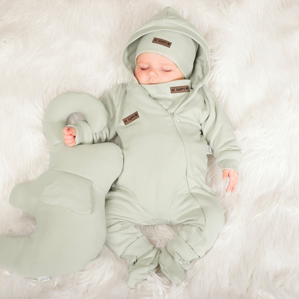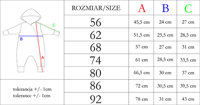 Pajac wykonany z zewnątrz z dresówki od środka posiada bawełniana podszewkę. Pajac zapinany jest na wygodny zamek - ułatwi to ubieranie. Materiał jest całkowicie bezpieczny dla skóry dziecka.