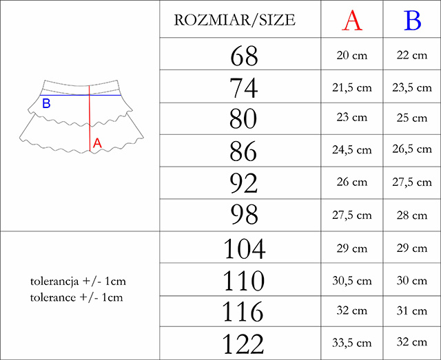 Spódniczka uszyta z bawełny z niewielką ilością elastanu. Materiał całkowicie bezpieczny skóry dla dziecka. Produkt ten będzie idealnym dopełnieniem kolekcji Rosy.