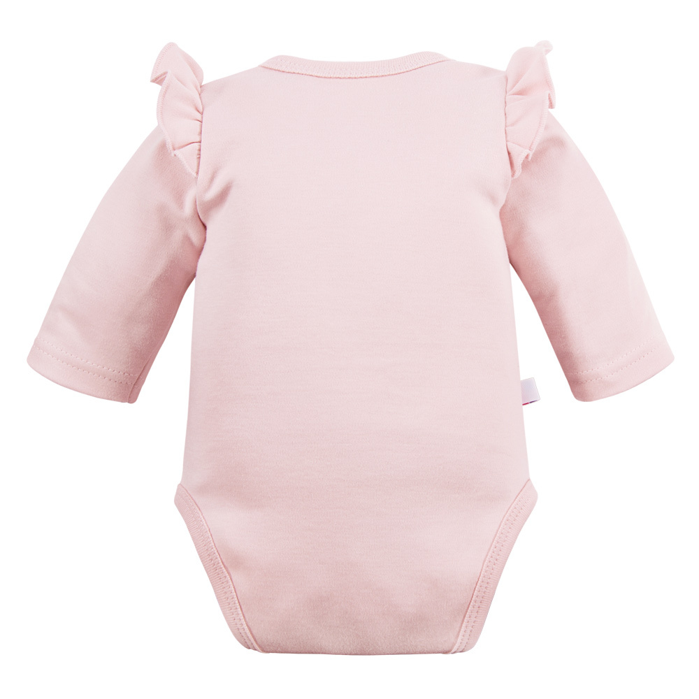 Body z długim rękawem w kolorze różowym z nadrukiem. Na ramionkach falbanki.