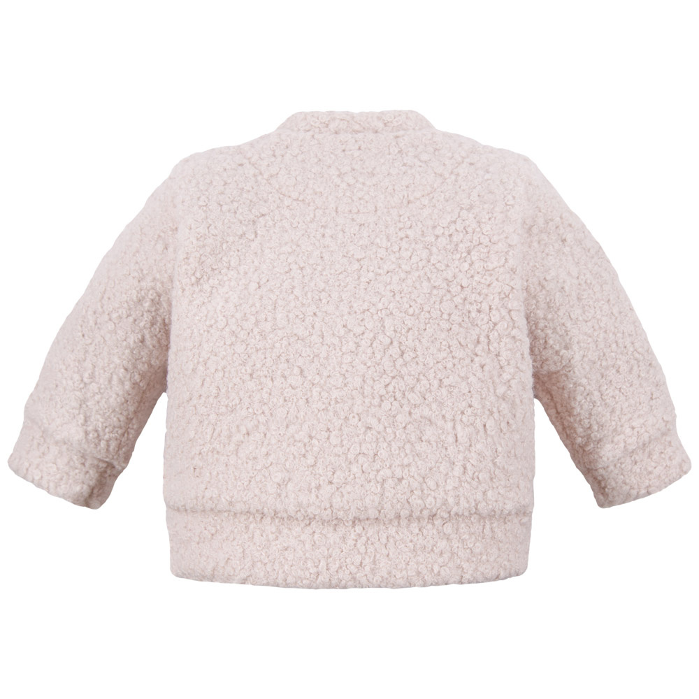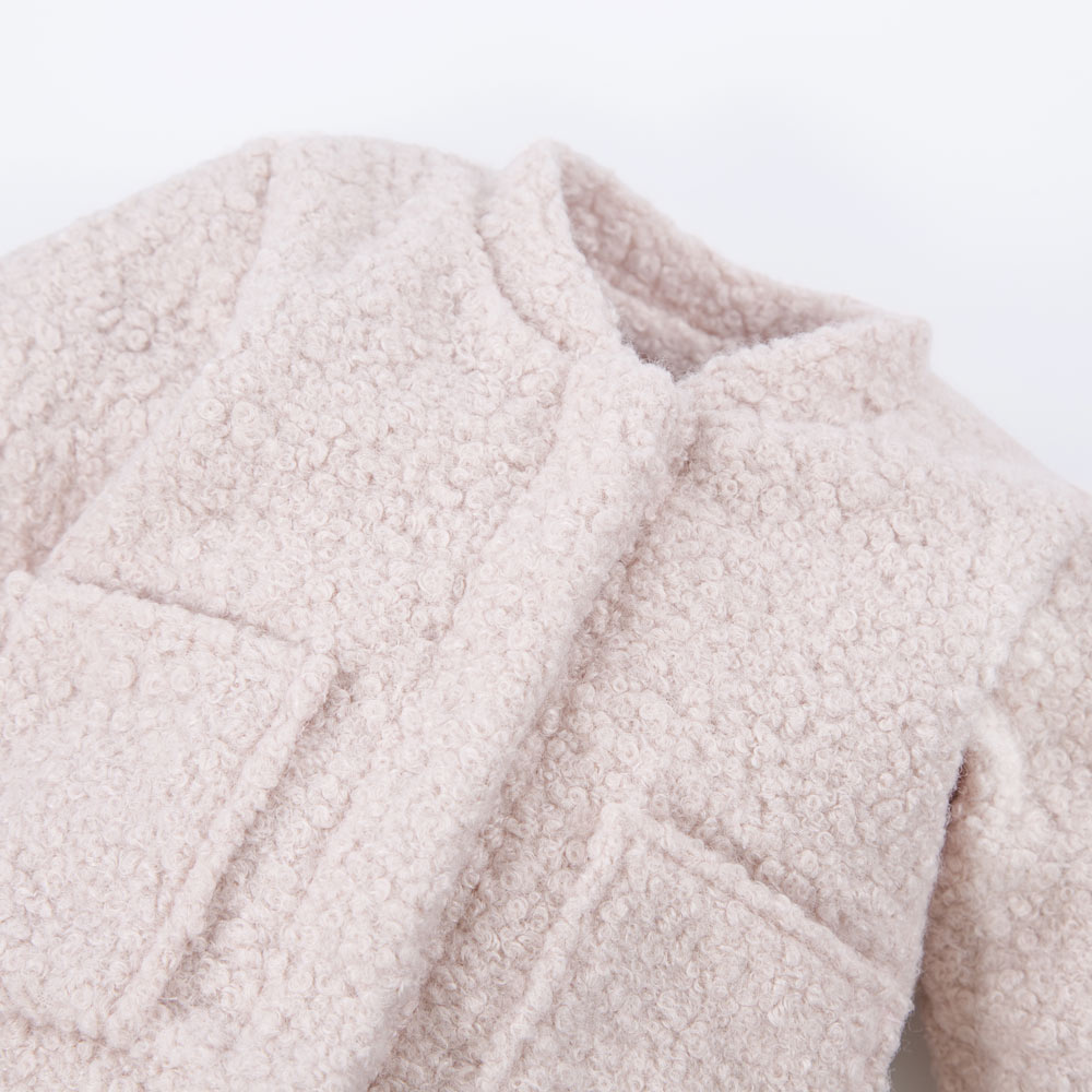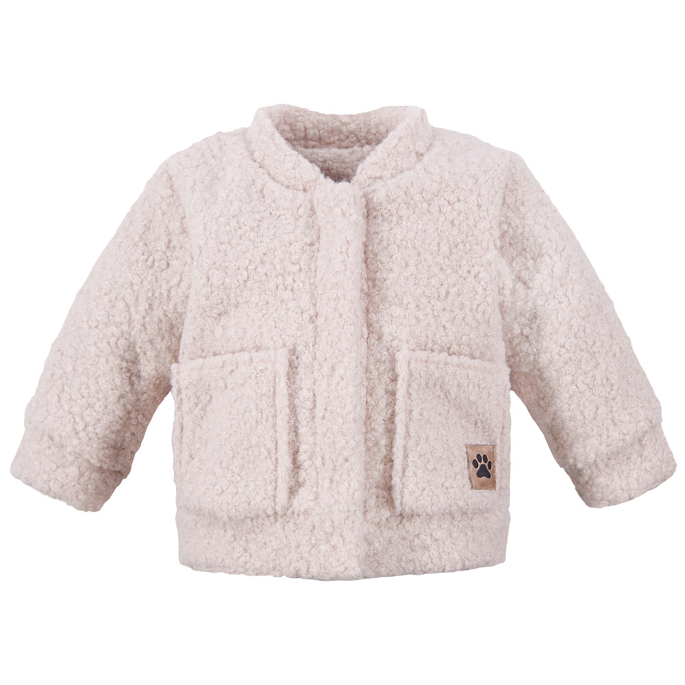 Kurtka wykonana z baranka. Jedna strona wykonana z bawełny, druga jest pluszowa. Model zapinany na napy. Materiał jest całkowicie bezpieczny dla skóry dziecka.
