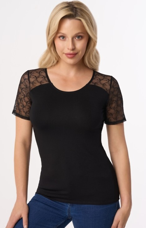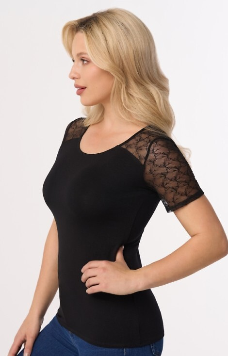 Bluzka posiada półokrągły dekolt. Ramiona i rękawki z koronki.