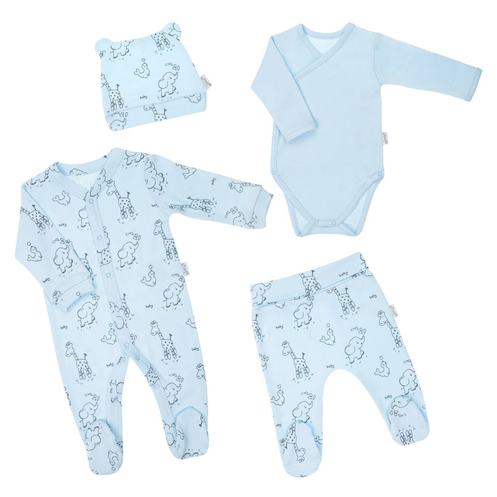 Produkty niezbędne do skompletowania pierwszej wyprawki niemowlęcej. Wszystkie są zapinane na wygodne bezniklowe napy, które niezwykle ułatwiają nam ubieranie dziecka. Produkty zostały uszyte z naturalnego materiału -z bawełny 100%, która jest całkowicie bezpieczna dla skóry dziecka urozmaicona we wzór z motywem zwierzątek. W skład zestawu wchodzą: body, pajac , półśpiochy oraz czapka. Wszystko mieści się w ozdobnym pudełku.