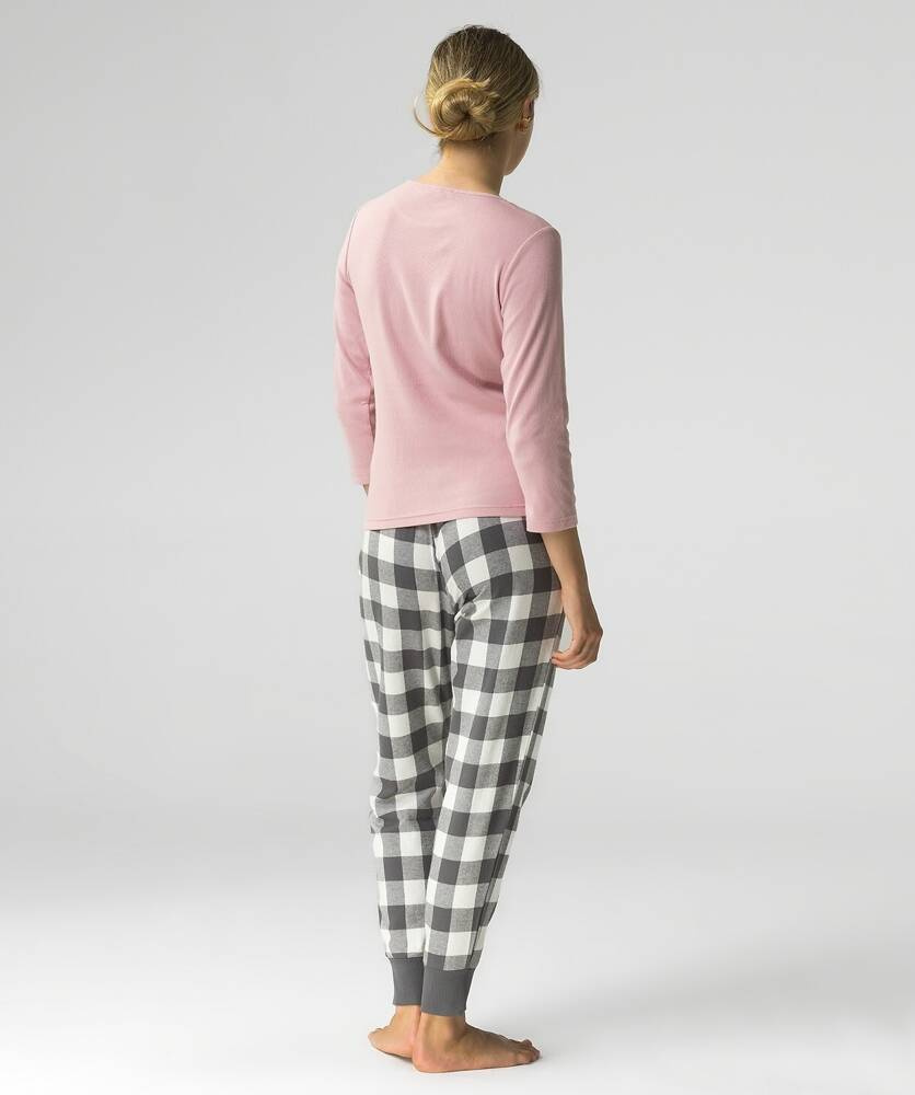 Damska piżama o pięknej kolorystyce to ciekawa propozycja w nadchodzącym sezonie. Spodnie z kieszeniami oraz bezuciskową gumą w pasie zapewniają komfort i swobodę użytkowania. Góra od piżamy to bluzka z długim rękawem. To ciekawy i ponadczasowy wzór, który sprawia, że całość nabiera klasycznego wyrazu.