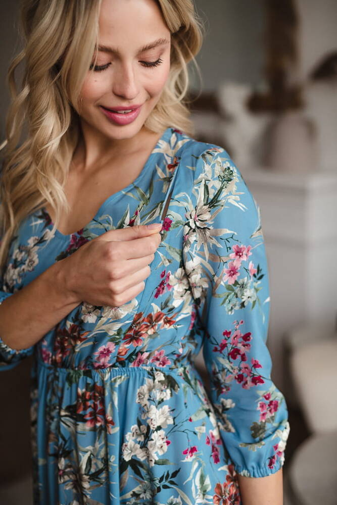 Sukienka dla mamy karmiącej piersią z falbankami, pod którymi ukryliśmy zamki, które otwierają się od góry. Model na czas ciąży i później do karmienia piersią . Z gumką pod biustem, dzięki czemu pięknie się układa i na brzuszku ciążowym i po porodzie