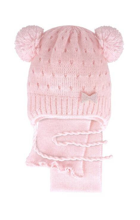 Czapka dla dziewczynki z pomponami i kokardką. Do kompletu szalik. Idealny na chłodne dni