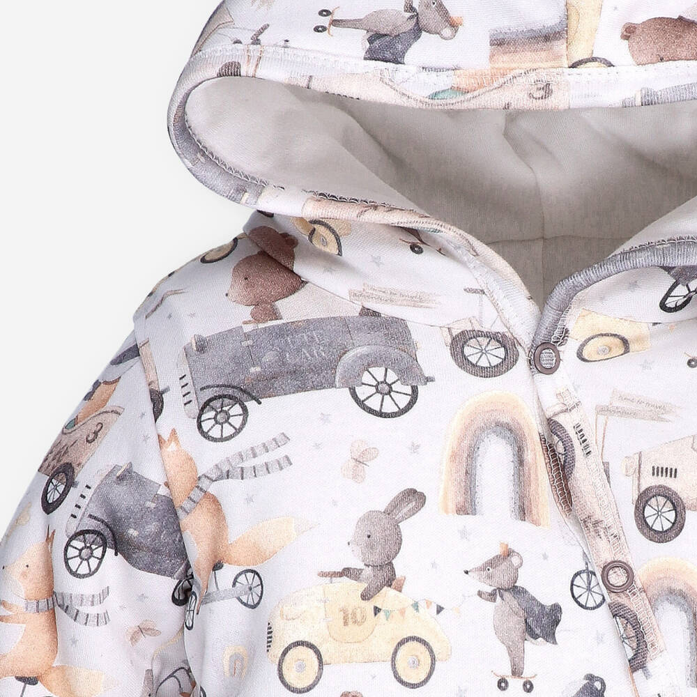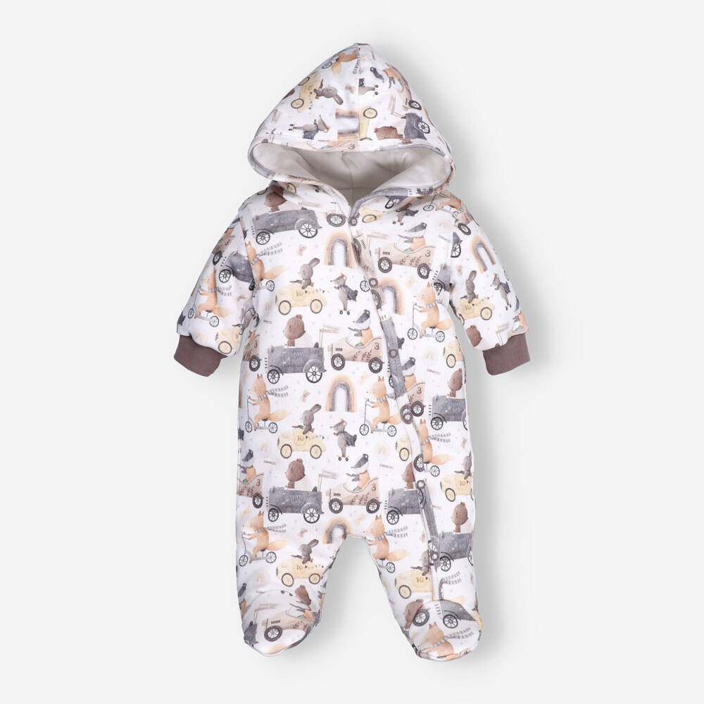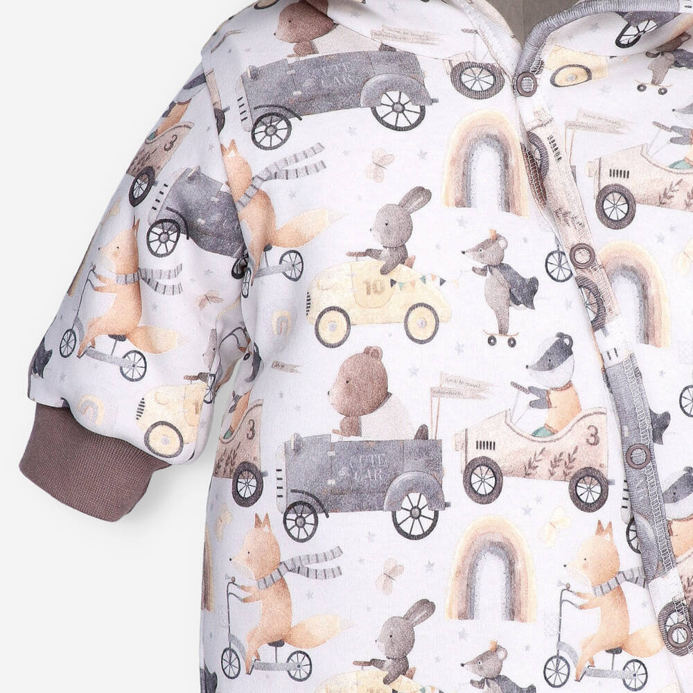 Dwuwarstwowy kombinezon niemowlęcy nieocieplany uszyty z miękkiej i przyjemnej w dotyku dresowej bawełny organicznej.