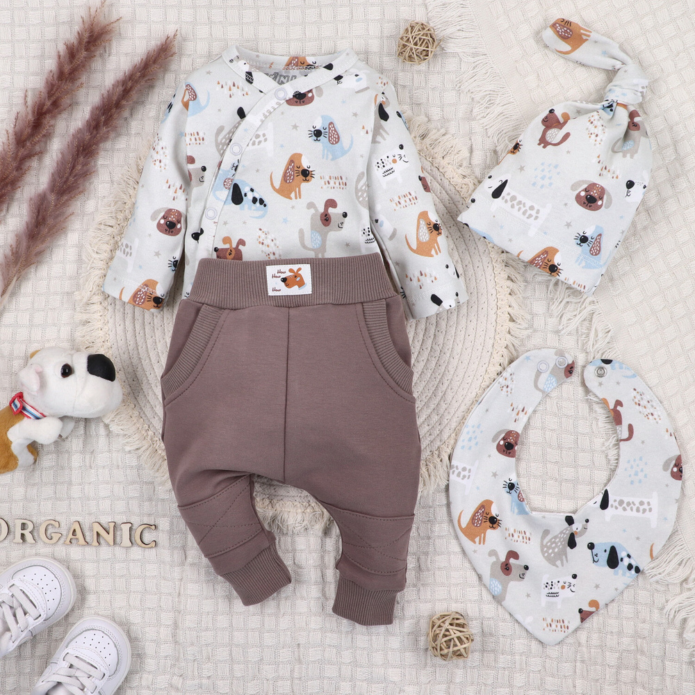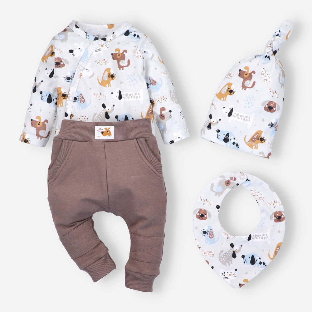 Komplet niemowlęcy, który składa się z body, spodni,czapeczki i apaszki.
