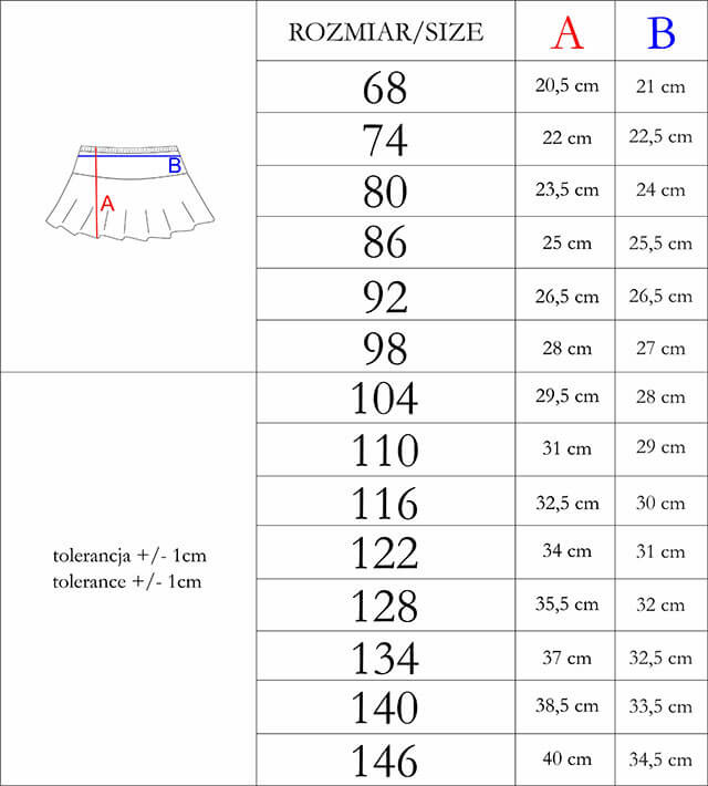 Nie krępująca ruchów, wygodna spódniczka. W pasie wszyto praktyczną gumkę, ułatwiającą ubieranie.