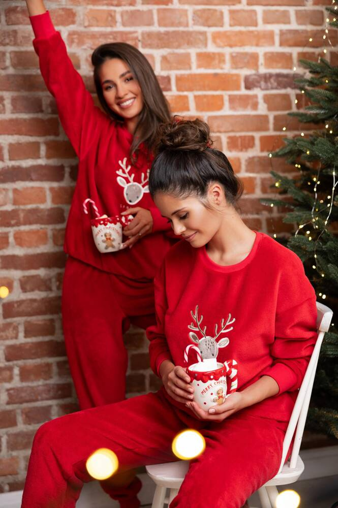 Piżama damska wykonana z wysokiej jakości miłego w dotyku materiału typu soft, która daje maksymalny komfort noszenia. Zapewnia pełną swobodę ruchów. Bluzeczka z długim rękawem oraz ozdobnym świątecznym motywem. Do kompletu długie, jednolite spodnie. Całość prezentuje się doskonale. Bardzo wygodny fason, delikatnie dopasowany do ciała. Spodoba się kobietom, które uwielbiają delikatność i swobodę.
