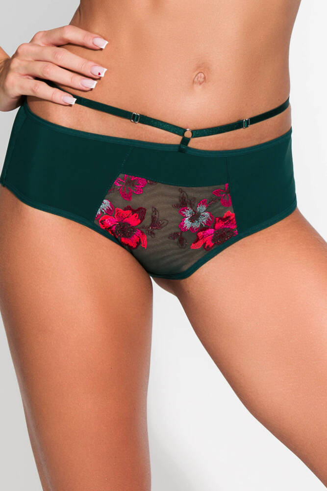 Fason o wyższym stanie, ozdobiony delikatnym paseczkiem w talii, subtelnie podkreśla sylwetkę, dodając wdzięku i pewności siebie. Wykonane z miękkiej, mięsistej mikrofibry. Przód zdobi siatka z kwiatowym wzorem, co dodaje figom unikalnego, dekoracyjnego akcentu. Tył fig jest płaski, wykończony podwójną warstwą tiulu.