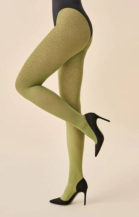 Rajstopy damskie o grubości 60 den z wyrazistym roślinnym wzorem. Optycznie wysmuklają nogi. Posiadają płaskie szwy. Bez wydzielonej części majteczkowej,