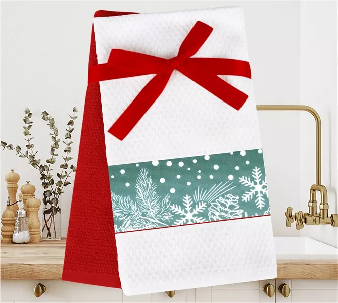 W skład kompletu wchodzą dwa ręczniki kuchenne. Wielkość każdego z nich to 40x60 cm. Jeden z ręczników wykonany jest z tkaniny frotte i jest jednobarwny, w czerwonym kolorze. Drugi natomiast posiada gofrowaną fakturę, jest biały. Zdobi go bordiura z nadrukiem wykonanym techniką 3D. Ręczniki te są zatem świetną ozdobą kuchni w okresie Bożego Narodzenia. Dodatkowo zestaw ten jest świetną opcją na niezobowiązujący, ale jakże praktyczny upominek dla bliskiej osoby.
