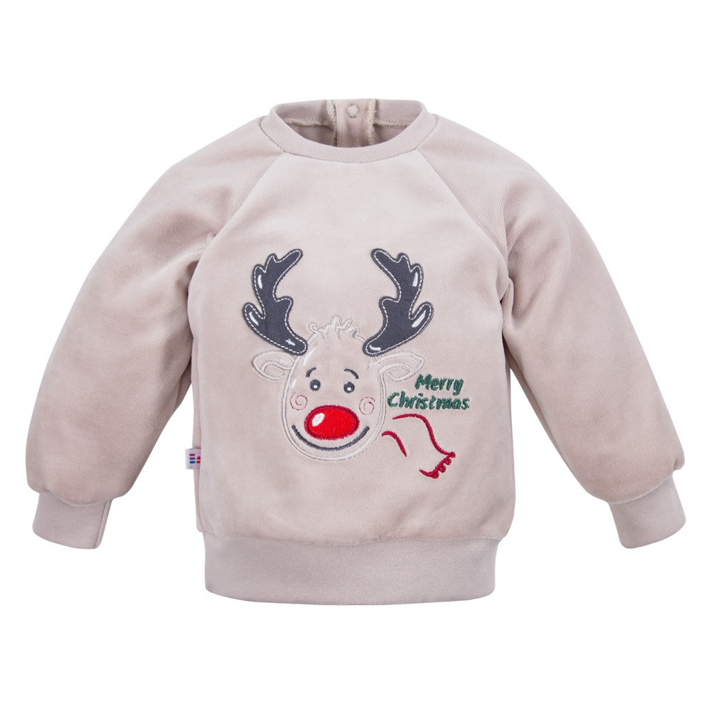 Świąteczna bluza z ciepłego weluru. Dzięki temu bluza jest milutka i bardzo ciepła, idealnie sprawdzi się zimą. Na przodzie bluzy wykonany duży haft renifera.