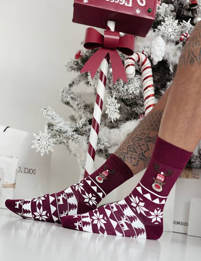 1290-022 Norweski Renifer Świąteczne Skarpety Męskie Milena - Bordowy