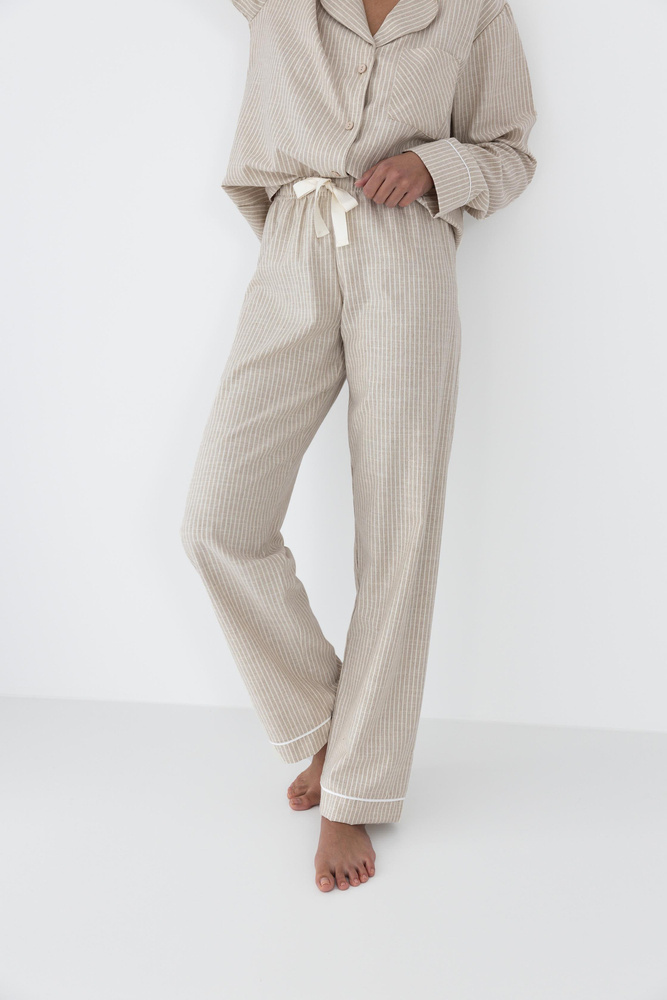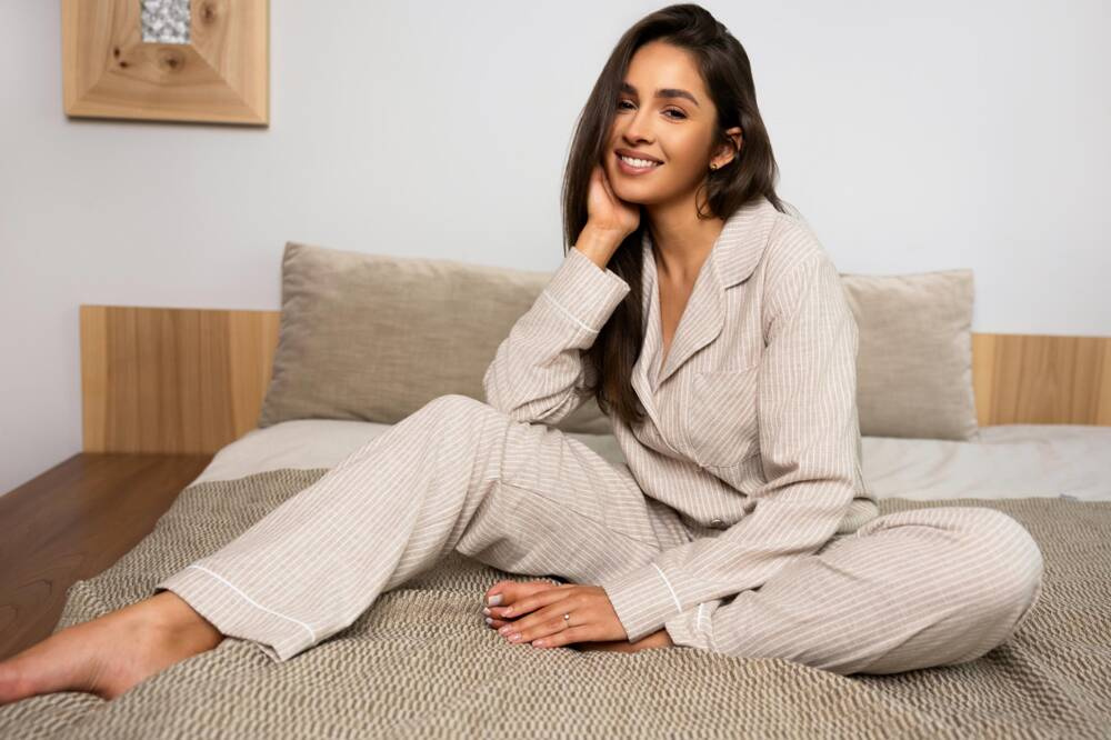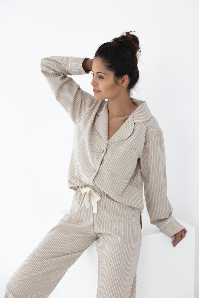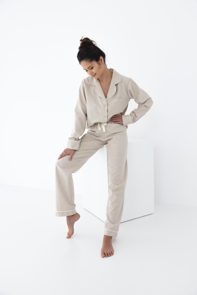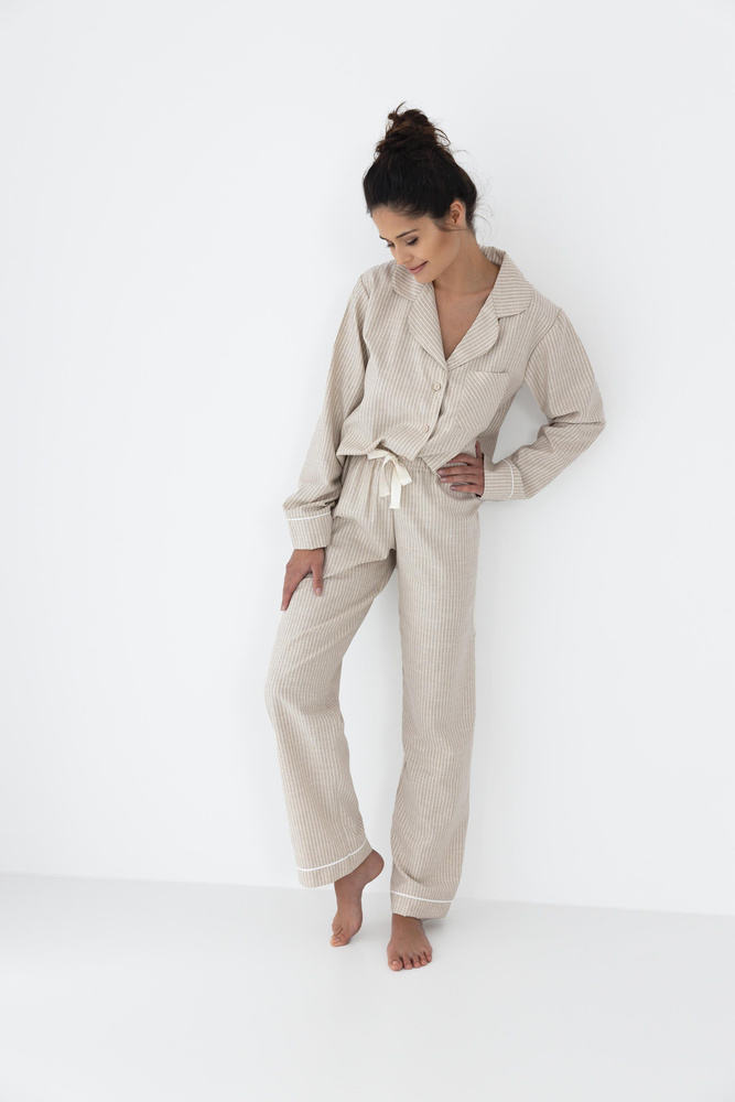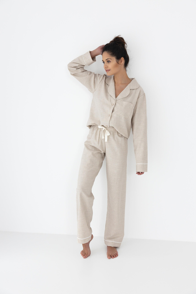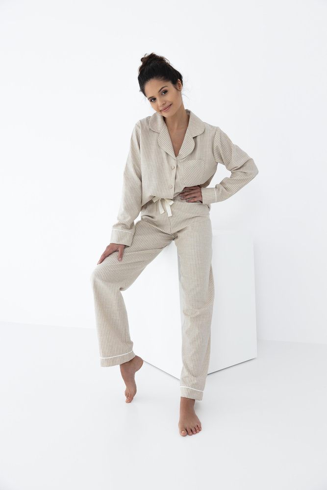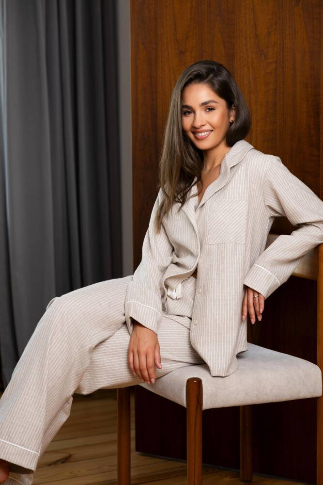 Komfortowa piżama damska. Uszyta z wysokogatunkowej bawełny, która daje maksymalny komfort noszenia. Koszulka z długim rękawem i kołnierzykiem. Do kompletu, długie, wzorzyste spodnie. Całość prezentuje się doskonale. Bardzo wygodny fason, delikatnie dopasowany do ciała. Spodoba się kobietom, które uwielbiają delikatność i swobodę.