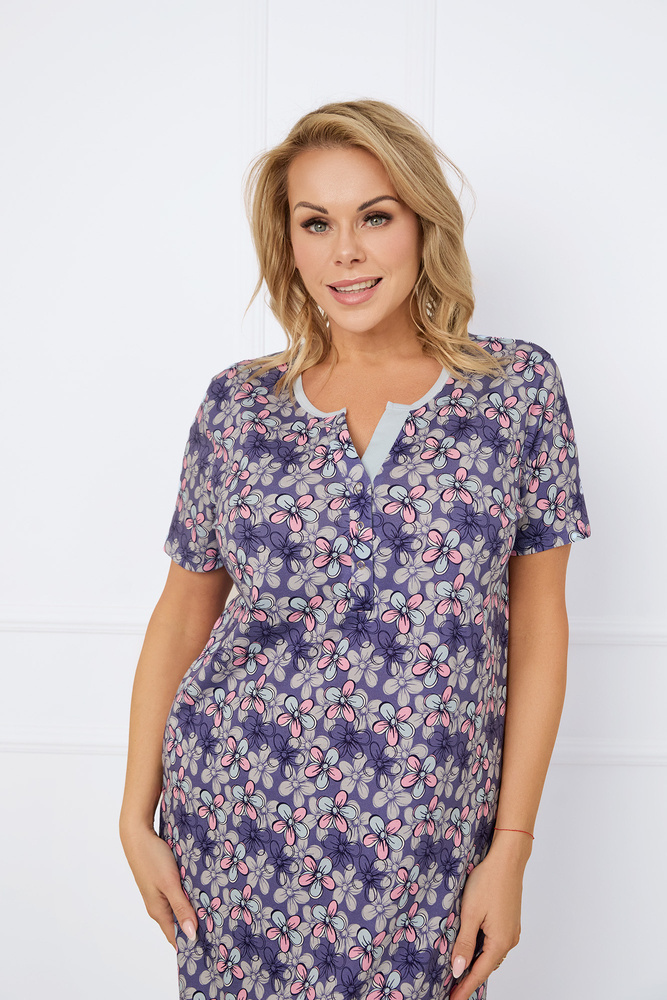 W przodzie okrągły dekolt, fantazyjnie przechodzący w zapięcie polo na napy - idealne rozwiązanie dla Mam karmiących piersią.