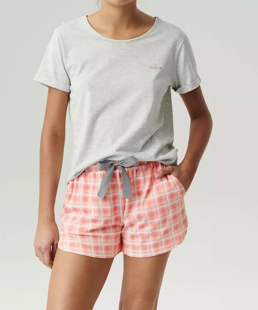 Letnia piżama damska  z krótkim rękawem .Luźne  szorty  z kieszeniami oraz troczkiem do regulacji .  To ciekawy i ponadczasowy wzór, który sprawia, że całość nabiera klasycznego wyrazu.