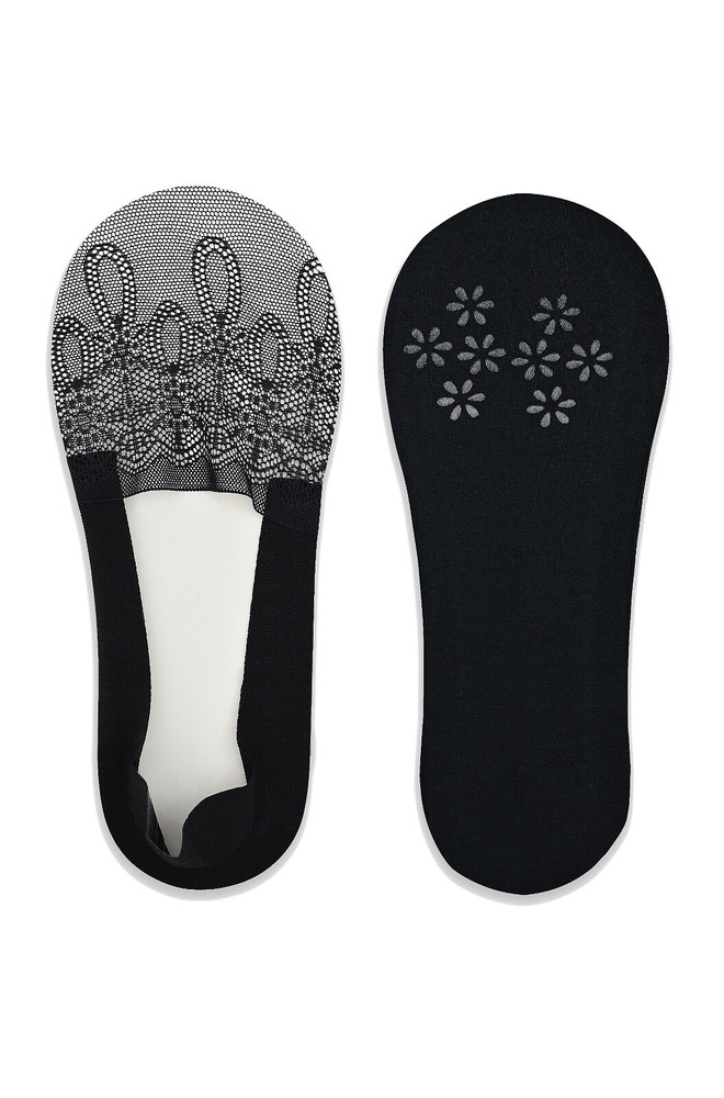 Balerinki damskie z koronki. Ściągacz z paskiem silikonu, zapobiega zsuwaniu. Podeszwa z gładkiej bawełny z silikonowymi kwiatkami. Idealnie dopasowują się do stopy. Chronią przed otarciami.