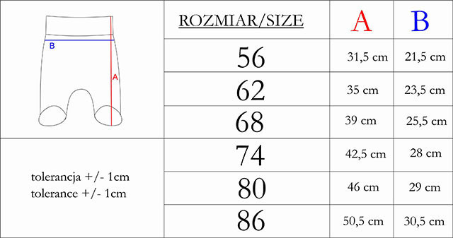 Półśpiochy dla niemowląt. Szeroki, nieuciskający ściągacz w pasie utrzymuje ubranko w odpowiednim miejscu, a anatomiczny kształt zapewnia dziecku wygodę podczas noszenia. Półśpioszki mają luźny fason i lekko obniżony stan by pomieścić pieluszkę, posiadają szeroki, bezuciskowy ściągacz w pasie zapewniający pełny komfort maluszkowi. Ściągacz można pozostawić odwinięty, wtedy tworzy on szeroki pas oplatający brzuszek dziecka lub odwinąć na pół.