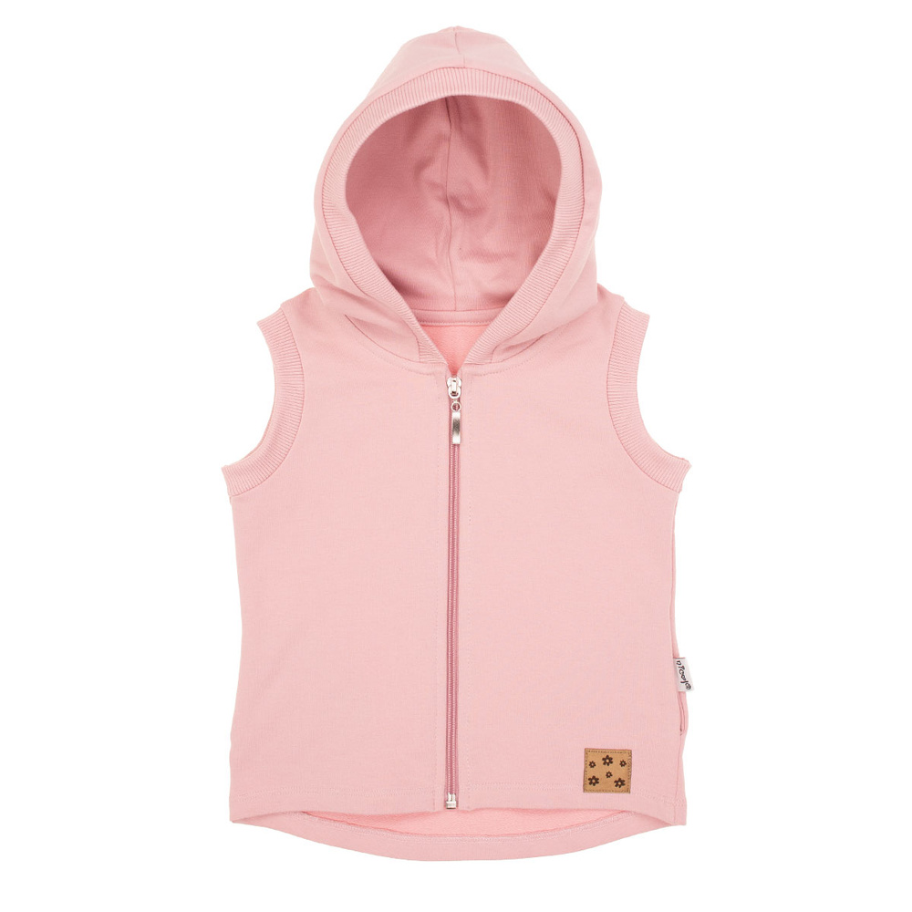 Bezrękawnik z kapturem, uszyty z bawełny dresowej z niewielką ilością elastanu. Paszki wykończone czarnym ściągaczem.