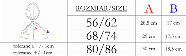 Chustka na głowę, idealna na gorące dni. Materiał posiada certyfikat Oeko-Tex Standard 100 Tekstylia godne zaufania. Wykończony ściągaczem, który dobrze dopasuje się do główki dziecka. Produkt jest wygodny i przewiewny.