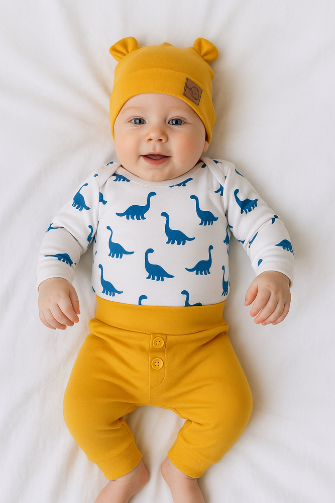 Mamy do zaoferowania komplet niemowlęcy, który składa się z body, spodni i czapki. Ubranka zostały wykonane z wysokiej jakości 100% bawełny.