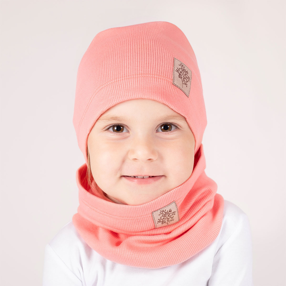 Czapka i komin z dresowej bawełny. Od środka podszyta jest bawełną z niewielką ilością elastanu, co sprawia, że czapka nie odkształca się i dobrze dopasowuje do główki dziecka. Materiał posiada certyfikat Oeko-Tex Standard 100 Tekstylia godne zaufania.