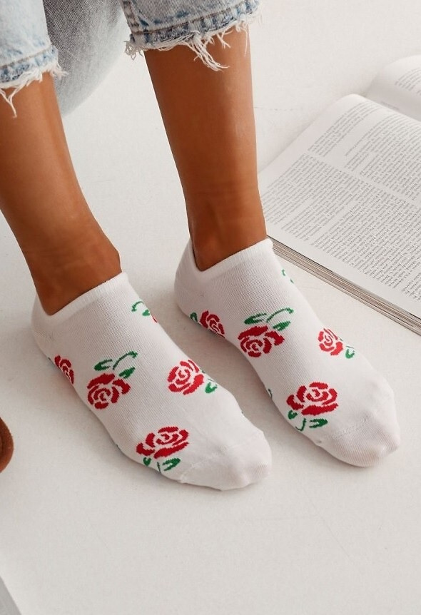 Bawełniane microstopki damskie ozdobione nadrukiem. Płaskie szwy, nieuciskający ściągacz. Na pięcie od wewnętrznej strony silikon zapobiegający zsuwaniu.