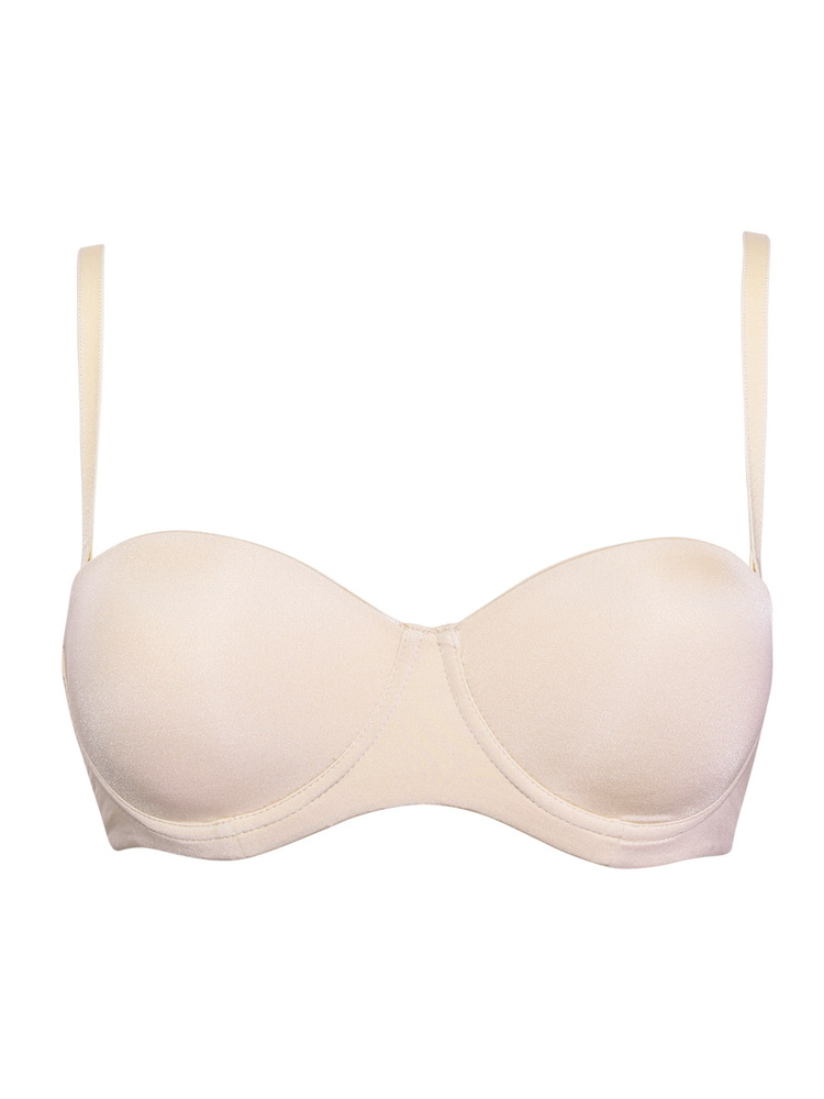 - Biustonosz bandeau – usztywniany, bezszwowe miseczki, fiszbiny, mikrofibra, silikonowe boczki, odpinane ramiączka.