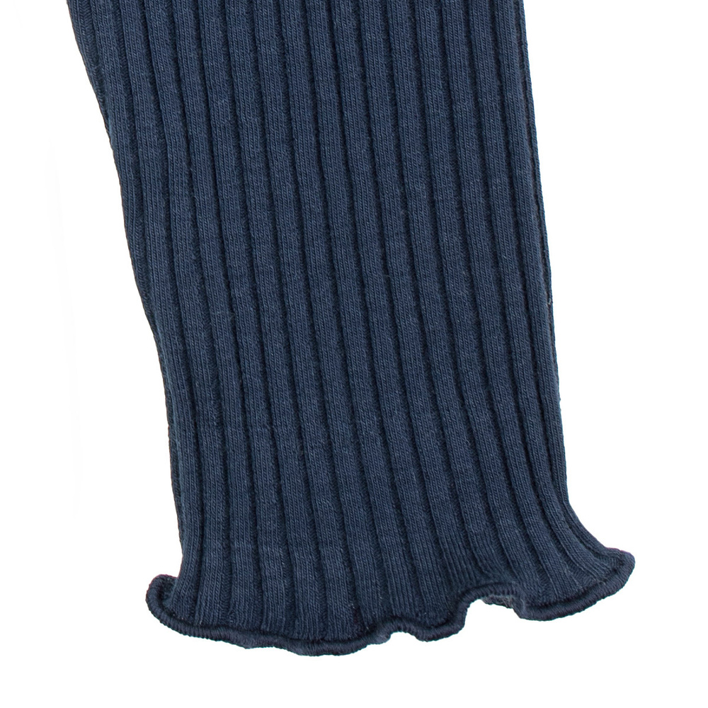 - Granatowe legginsy prążkowane z falbanką. Wygodne, elastyczne, bawełniane. Uszyte w Polsce – idealne do przedszkola i na spacer.