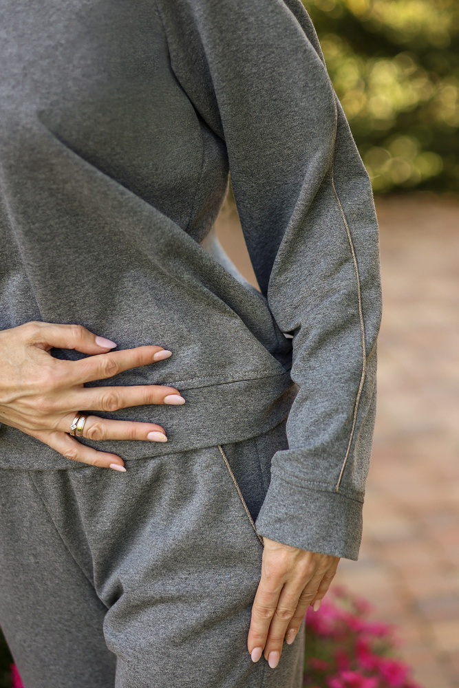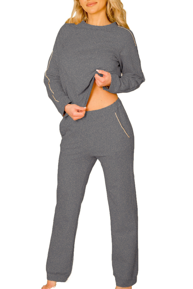 Elegancki dres damski Maio marki Mirale to doskonały wybór dla kobiet, które chcą czuć się wygodnie i wyglądać stylowo każdego dnia. Klasyczny fason z nowoczesnym akcentem — subtelnym połyskującym przeszyciem — sprawia, że komplet świetnie sprawdzi się zarówno w domu, jak i podczas wyjść na miasto.