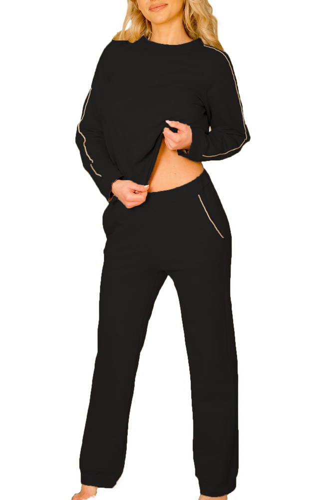 Elegancki dres damski Maio marki Mirale to doskonały wybór dla kobiet, które chcą czuć się wygodnie i wyglądać stylowo każdego dnia. Klasyczny fason z nowoczesnym akcentem — subtelnym połyskującym przeszyciem — sprawia, że komplet świetnie sprawdzi się zarówno w domu, jak i podczas wyjść na miasto.