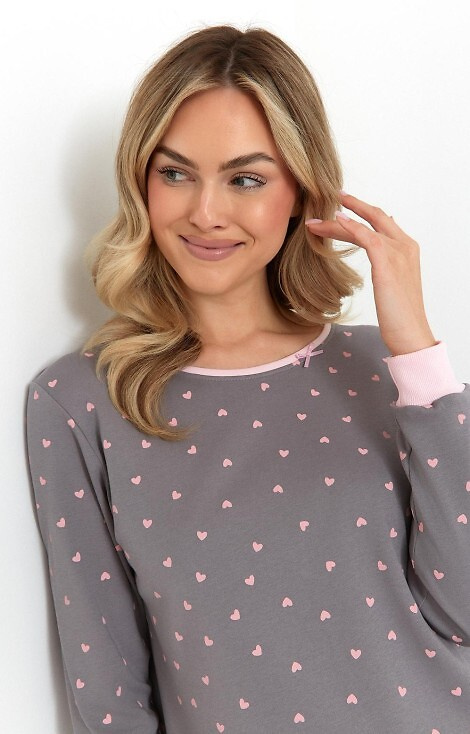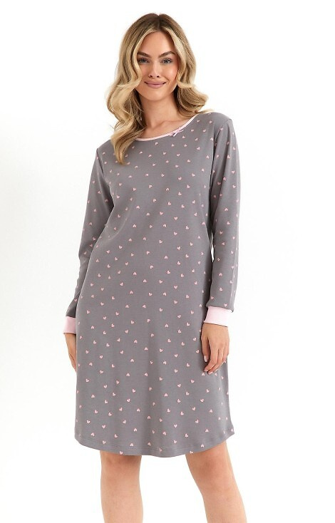 - Koszula nocna Cana 493 z miękkiej bawełny interlock. Wzór w serduszka, okrągły dekolt z kokardką, długi rękaw i praktyczne ściągacze przy mankietach. Klasyczna długość do kolan.