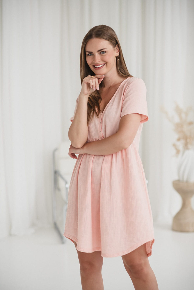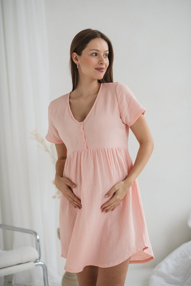 Uszyta z wyjątkowo miękkiego muślinu bawełnianego, otula ciało jak ciepły dotyk – przewiewna, oddychająca i w pełni bezpieczna dla wrażliwej skóry mamy i dziecka. Jej luźny, swobodny fason rośnie razem z brzuszkiem w ciąży, a dyskretne napy na piersiach sprawiają, że karmienie jest intuicyjne i komfortowe, nawet w nocy.