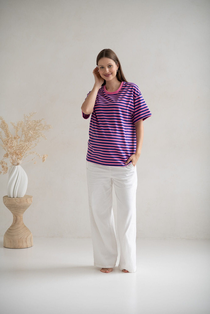 T-shirt do karmienia i ciąży Mamahood oversize z krytymi zamkami OEKO-TEX Milk&Love różowo-niebieskie paski