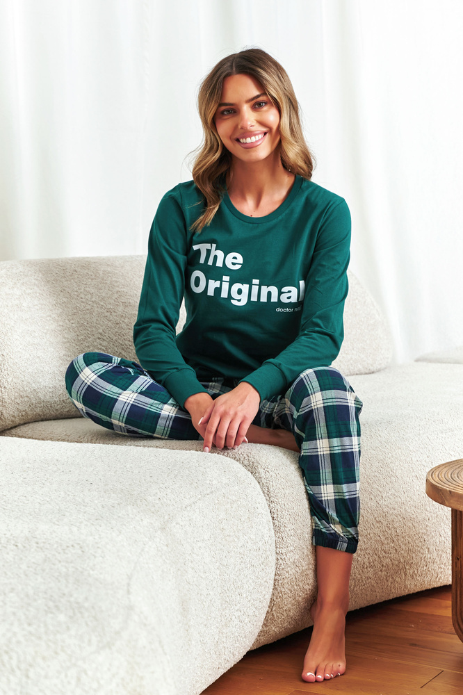 Doctor Nap 7340 to piżama damska z bawełnianą bluzką z napisem „The Original” i spodniami w kratę z wygodną gumką w pasie. Klasyczny fason i miękkie materiały gwarantują komfort snu. Ten model jest częścią kolekcji, którą możesz skompletować dla całej rodziny – mama, tata i dziecko w pasujących piżamach. Świetny pomysł na prezent! Produkt polski.