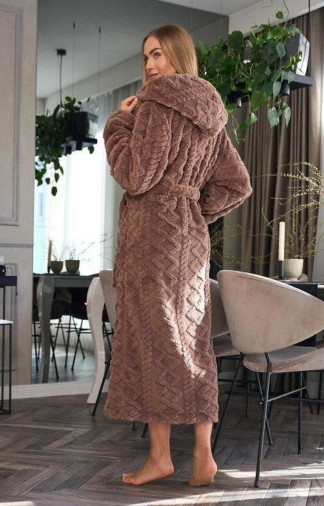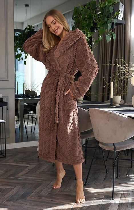 Długi szlafrok damski z kapturem L&L 2402 Geo – ciepły, miękki, z kieszeniami- czekoladowy