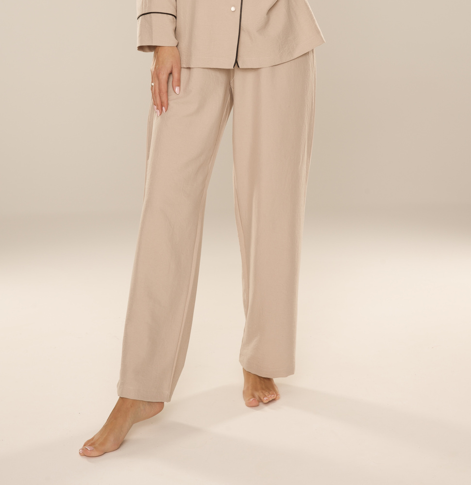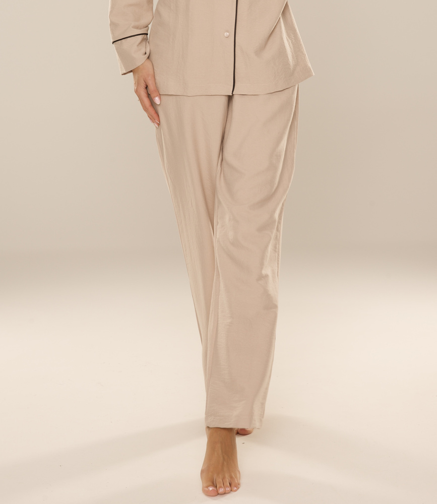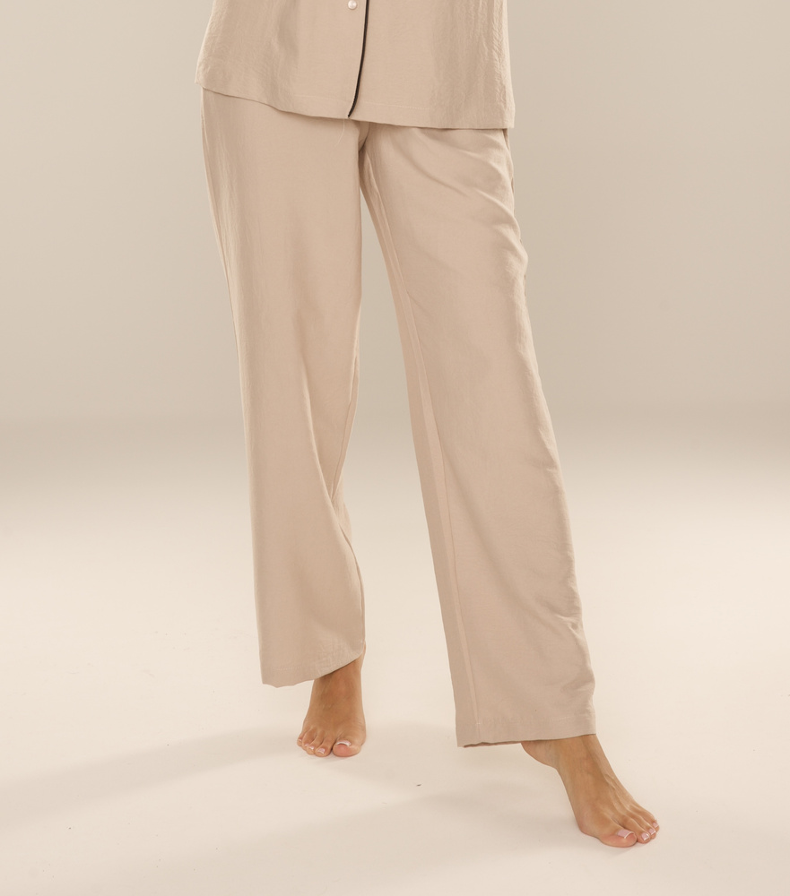 • Gładkie piżamowe spodnie o luźnym kroju. Miękki materiał, wygodny pas i kieszenie – wszystko, czego potrzebujesz.