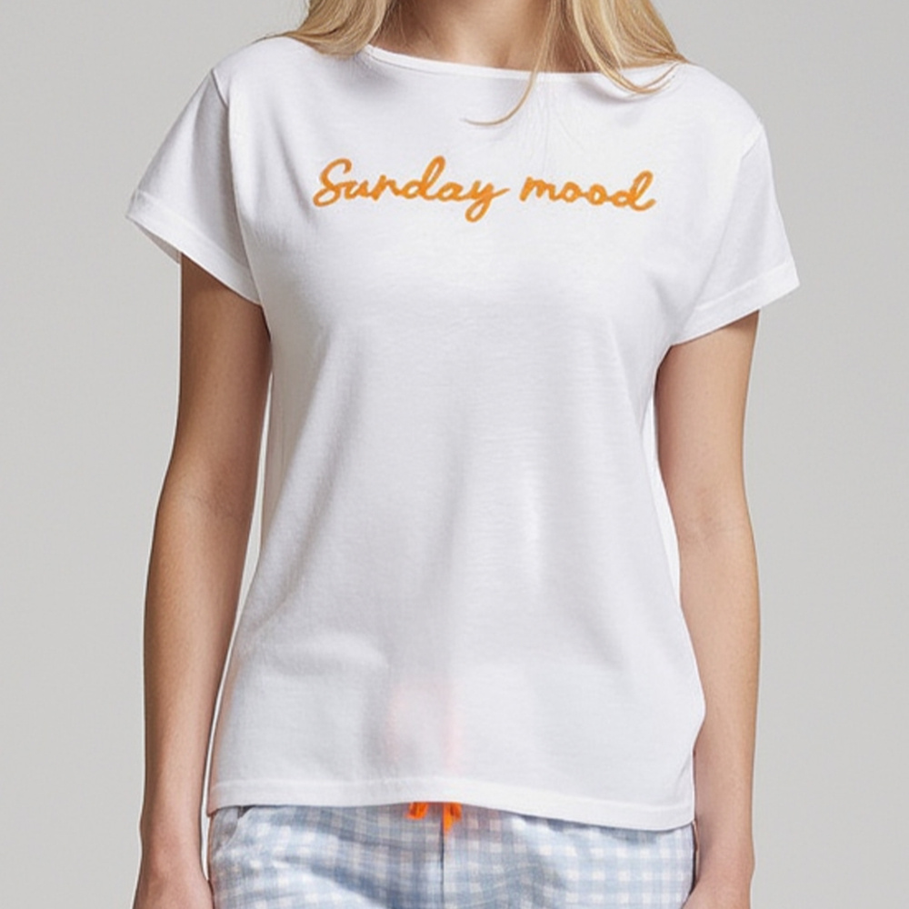 Góra piżamy to klasyczna koszulka z krótkim rękawem, okrągłym dekoltem oraz kontrastowym haftem, który dodaje całości uroku.