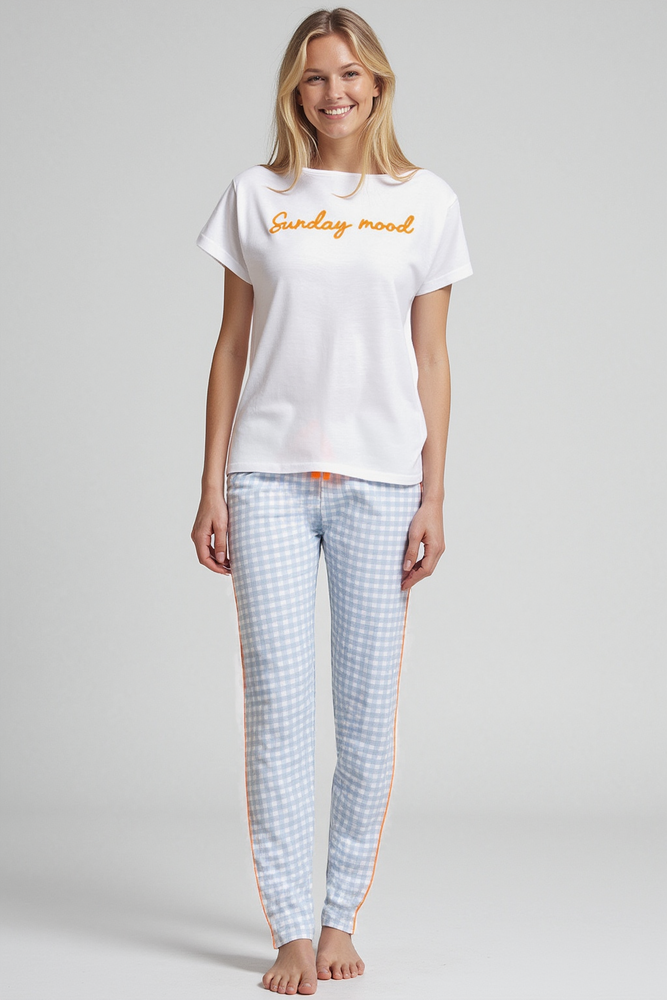 Dana Sorbetto niebieska – bawełniana piżama damska z haftem i spodniami w kratkę