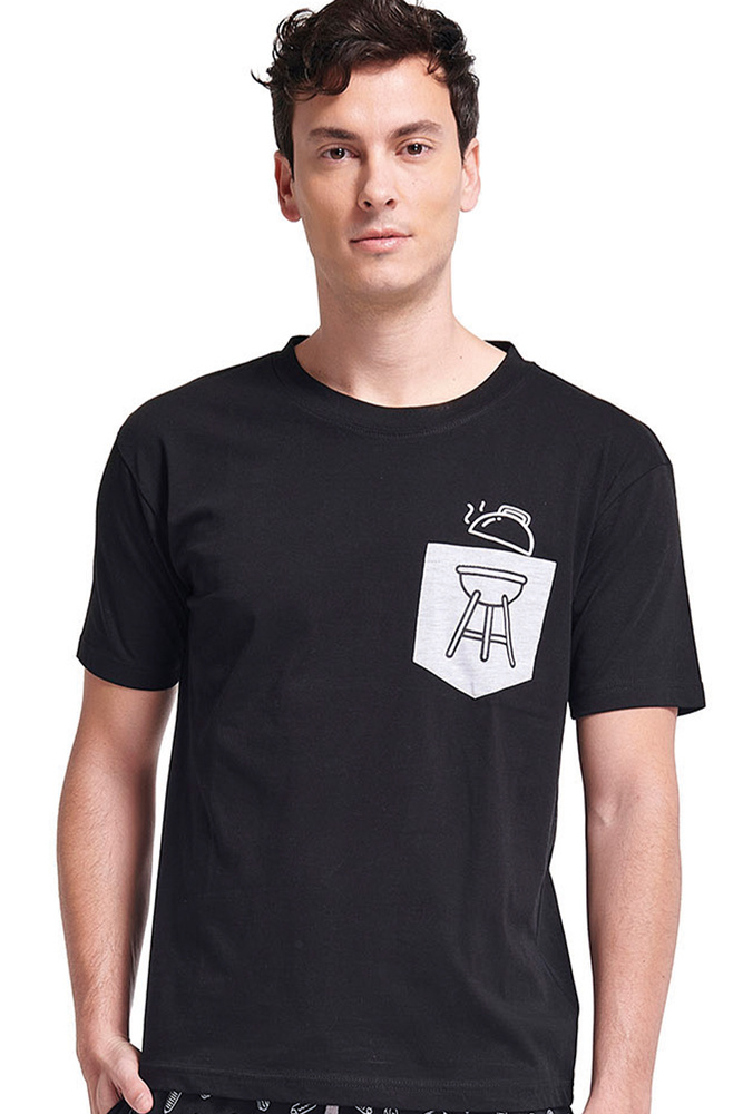 - Dwuczęściowa piżama męska z koszulką z nadrukiem i wygodnymi szortami. Lekki, codzienny zestaw do spania i relaksu.